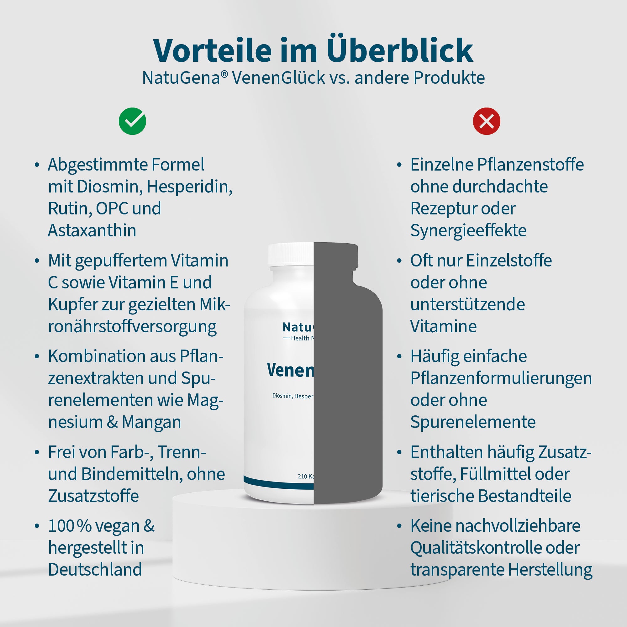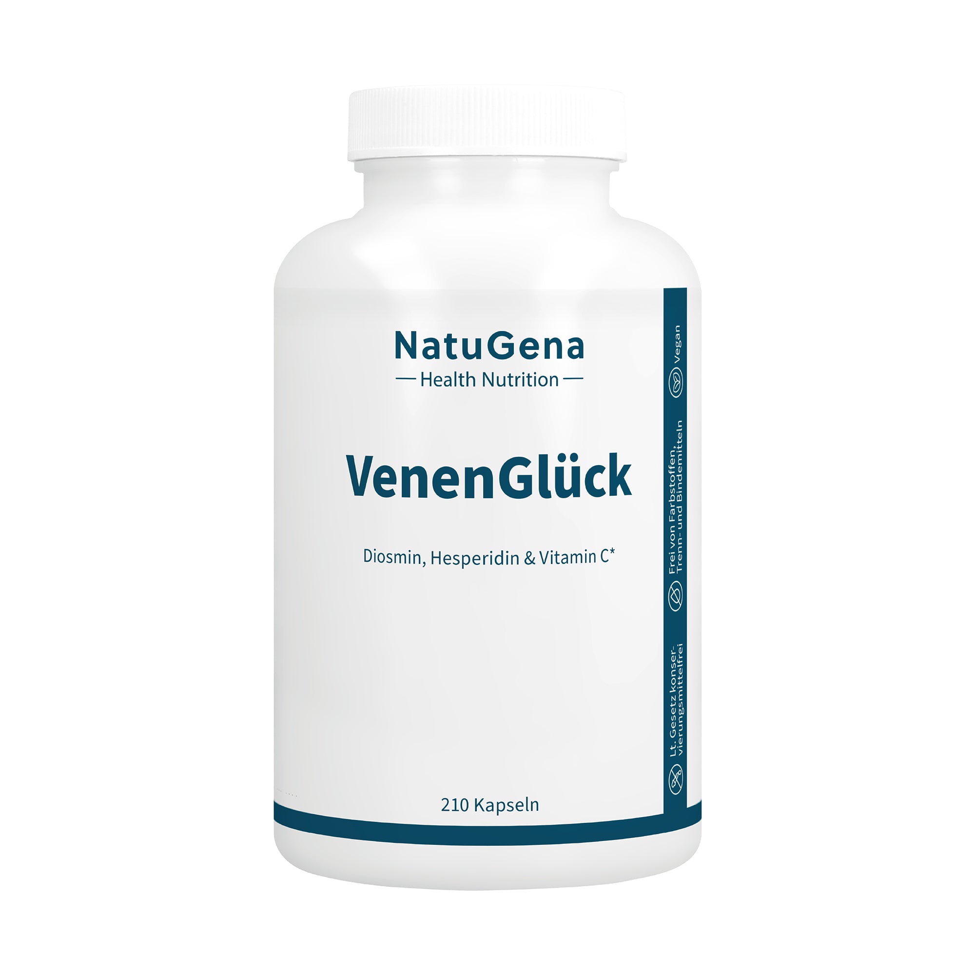 VenenGlück von NatuGena – Mit wertvollen Pflanzenextrakten wie Traubenkern, Rotes Weinlaub und Sophora Japonica (enthält Rutin), ergänzt durch bewährte Stoffe wie Diosmin und Hesperidin. Zusätzlich sind Vitamin C, Vitamin E und Kupfer enthalten. 210 vegane Kapseln für eine 30-Tage-Versorgung.